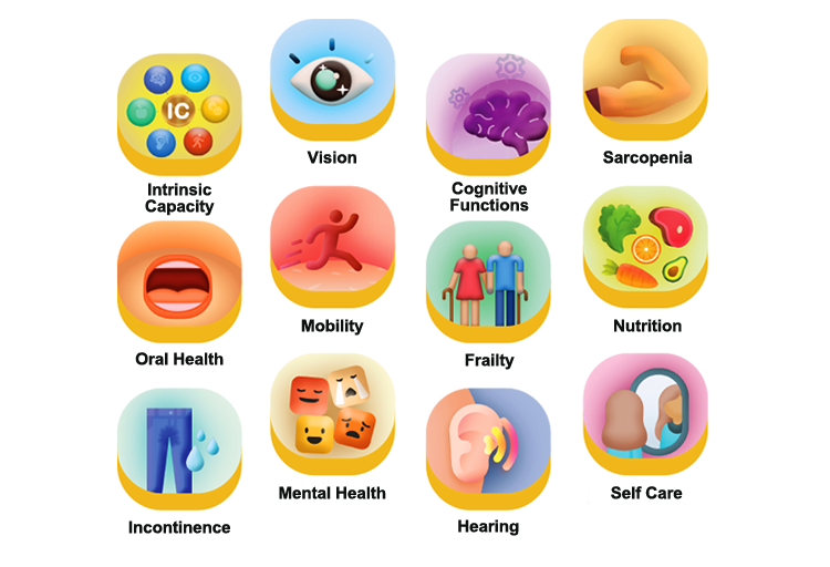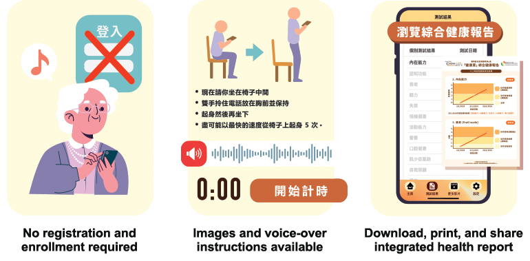 Provides 12 ageing-related health screenings to monitor the health condition of older adults anytime, anywhere.