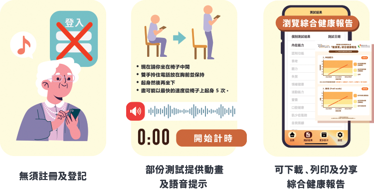 提供12个与老龄化相关的健康测试,随时随地了解长者的健康状况。