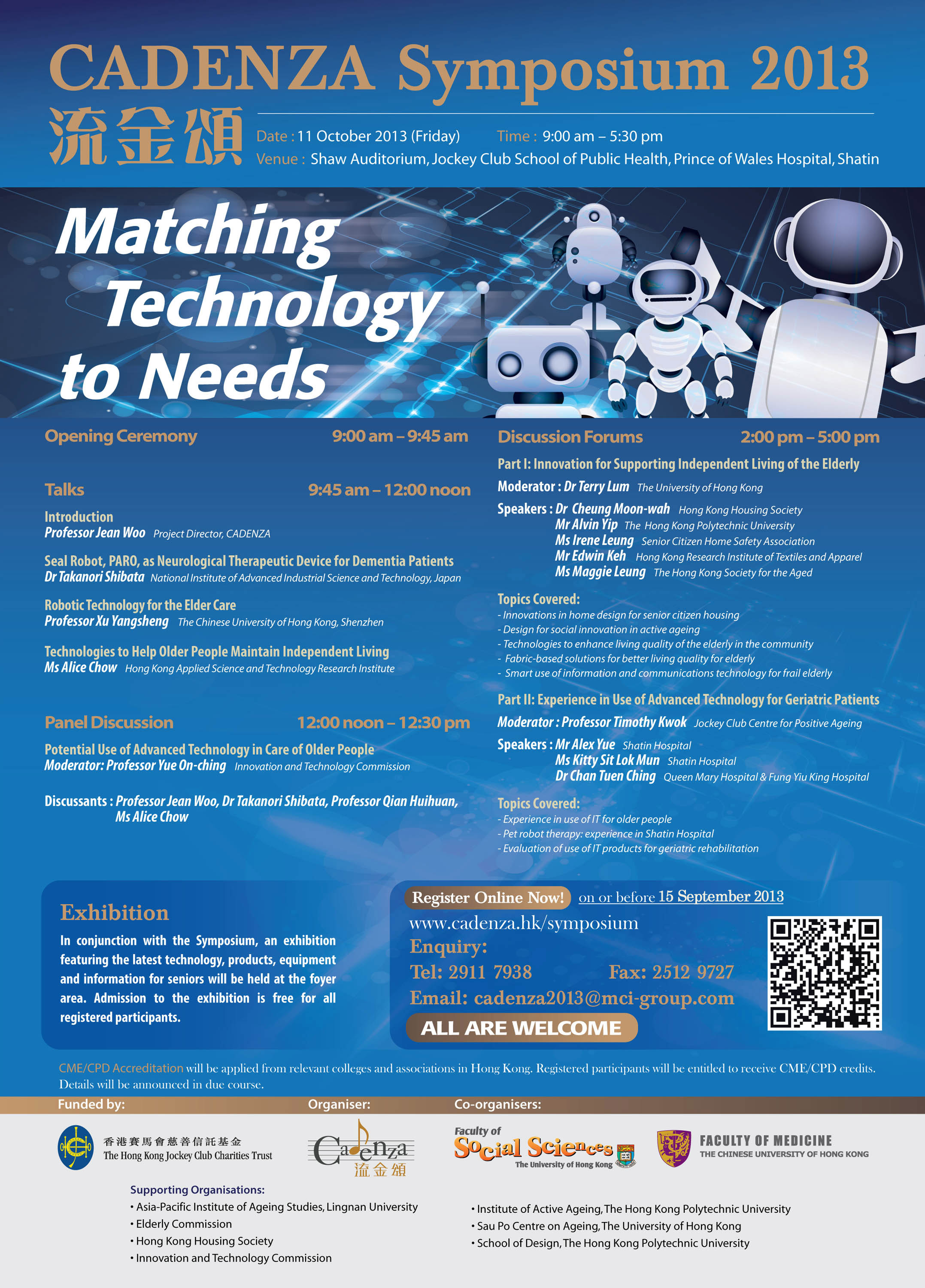 The symposium focused on the use of advanced technology in care of elderly people and supporting independent living. Both overseas and local experts were invited to speak at the Symposium. Overseas speakers included Dr. Takanori Shibata, the inventor of a seal robot named PARO that has documented psychological benefits of animal therapy for dementia patients and that has been certified by the U.S. Federal Drug Administration as a medical device. Local experts included The Chinese University of Hong Kong Pro-Vice-Chancellor and Professor of Automation and Computer-Aided Engineering Professor Xu Yangsheng, CADENZA Project Director Professor Jean Woo, Jockey Club Centre for Positive Ageing Director Professor Timothy Kwok as well as representatives from Innovations and Technology Commission, Hong Kong Housing Society, Hong Kong Polytechnic University School of Design and Shatin Hospital.